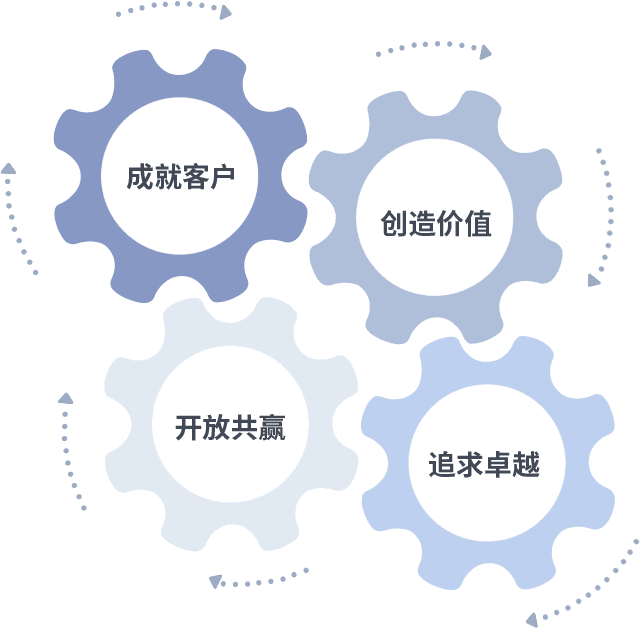 成就客户是一切决策的出发点,,,,创造价值是衡量所有工作的标准,,,,追求卓越是我们做事做人的态度,,,开放共赢是我们的格局也是最终的结果。。价值观的齿轮环环相扣,,,推动着组织里的每个人不断向前。。