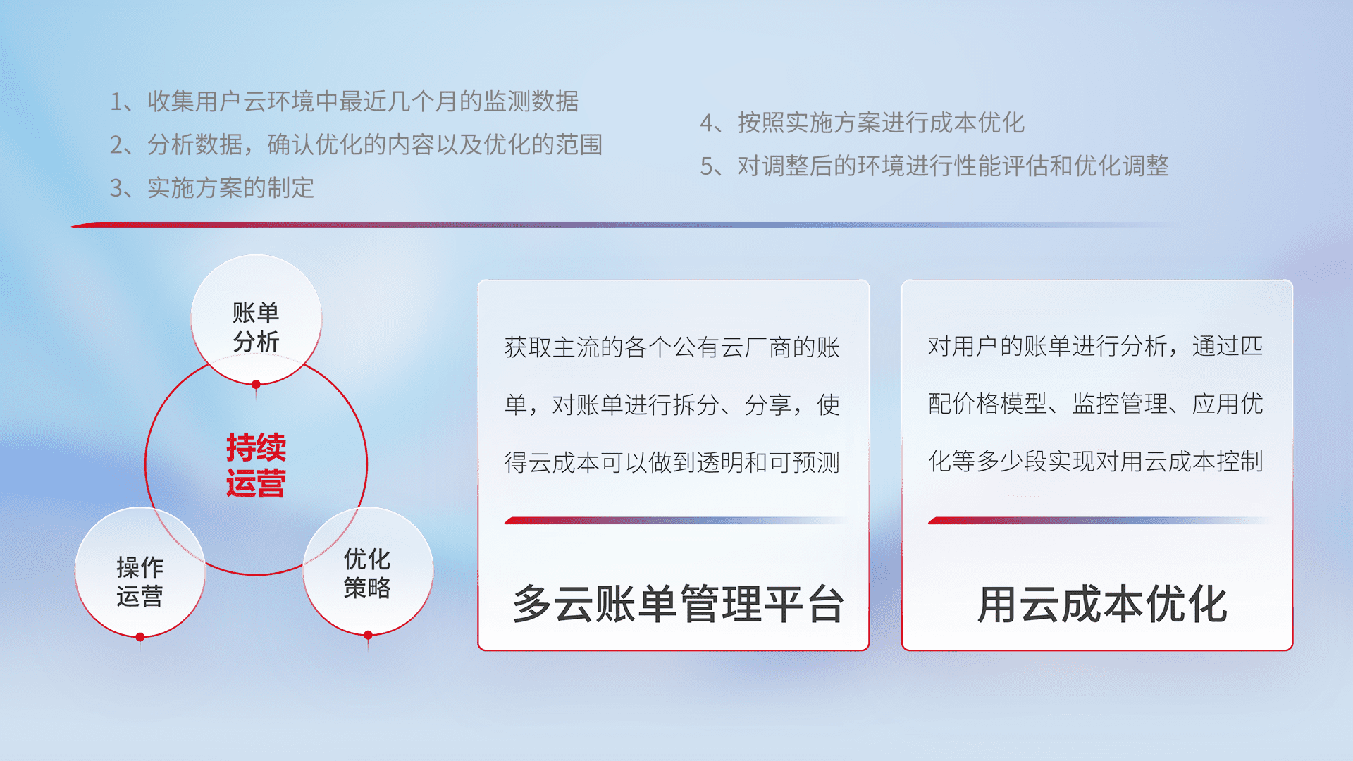 通过多云纳管,,以统一的资源数据模型把客户的云资源进行抽象和封装,,,,进而实现对多云资源的统一操作,,,保障云资源管理的可靠性、、稳定性与可用性。。。。量身定制化运维内容,,配置、、开发运维、、补丁管理、、备份、、、监控、、认证和访问管理、、审计和日常巡检等,,,,保障在用云过程中的可靠度,,稳定度以及高可用率。。。。
